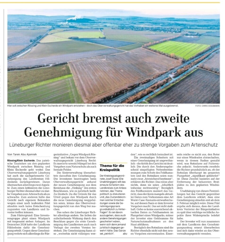 ●●● OVG Lüneburg kassiert erneut Windpark-Genehmigung bei Rössing/Klein Escherde. ●●● Gericht kritisiert unklare Artenschutzvorgaben und formale Mängel. ●●● Urteil könnte Präzedenzwirkung für weitere Projekte entfalten – auch im Ambergau. ●●●